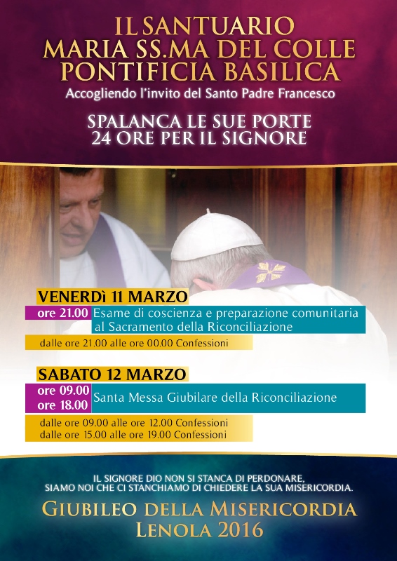 Accogliendo l'invito proposto da papa Francesco nella Bolla di indizione del Giubileo, il Santuario Maria SS.ma del Colle di Lenola, Pontificia Basilica, celebra l'iniziativa “24 ore per il Signore”, spalancando le sue porte nelle giornate dell'11 e 12 marzo, per dare espressione alla necessità della preghiera alla Madre di Misericordia, anche attraverso il sacramento della Riconciliazione.