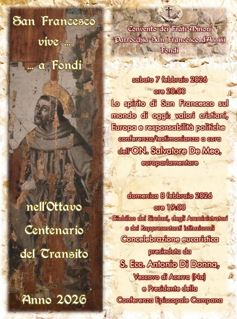 Nel contesto delle iniziative per l’VIII Centenario del Transito del Poverello d’Assisi, “San Francesco vive… a Fondi”, il Convento dei Frati Minori e la Parrocchia loro affidata a Fondi promuovono due importanti appuntamenti di riflessione e di preghiera, per attualizzare il messaggio del Santo di Assisi nella vita ecclesiale, sociale e istituzionale del nostro tempo.