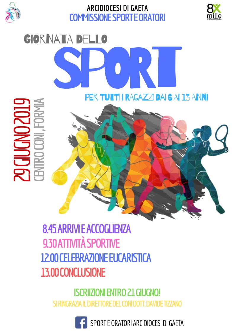 Sabato 29 Giugno presso il Coni di Formia ci sarà la Giornata Diocesana dello Sport, l’ultima tappa dell’anno pastorale della Commissione Sport e Oratori. Passeremo una giornata con i ragazzi dai 6 ai 13 anni e i loro allenatori ed educatori nella casa dello Sport nazionale, il centro Coni di Formia, sarà l’occasione di conoscere anche i cosiddetti sport minori e approfondire tutti quei valori propri dello sport. La giornata concluderà con la Celebrazione Eucaristica celebrata dal nostro Arcivescovo Mons. Luigi Vari. Un grazie di cuore al direttore del centro Coni di Formia dott. Davide Tizzano per la disponibilità e l’accoglienza.