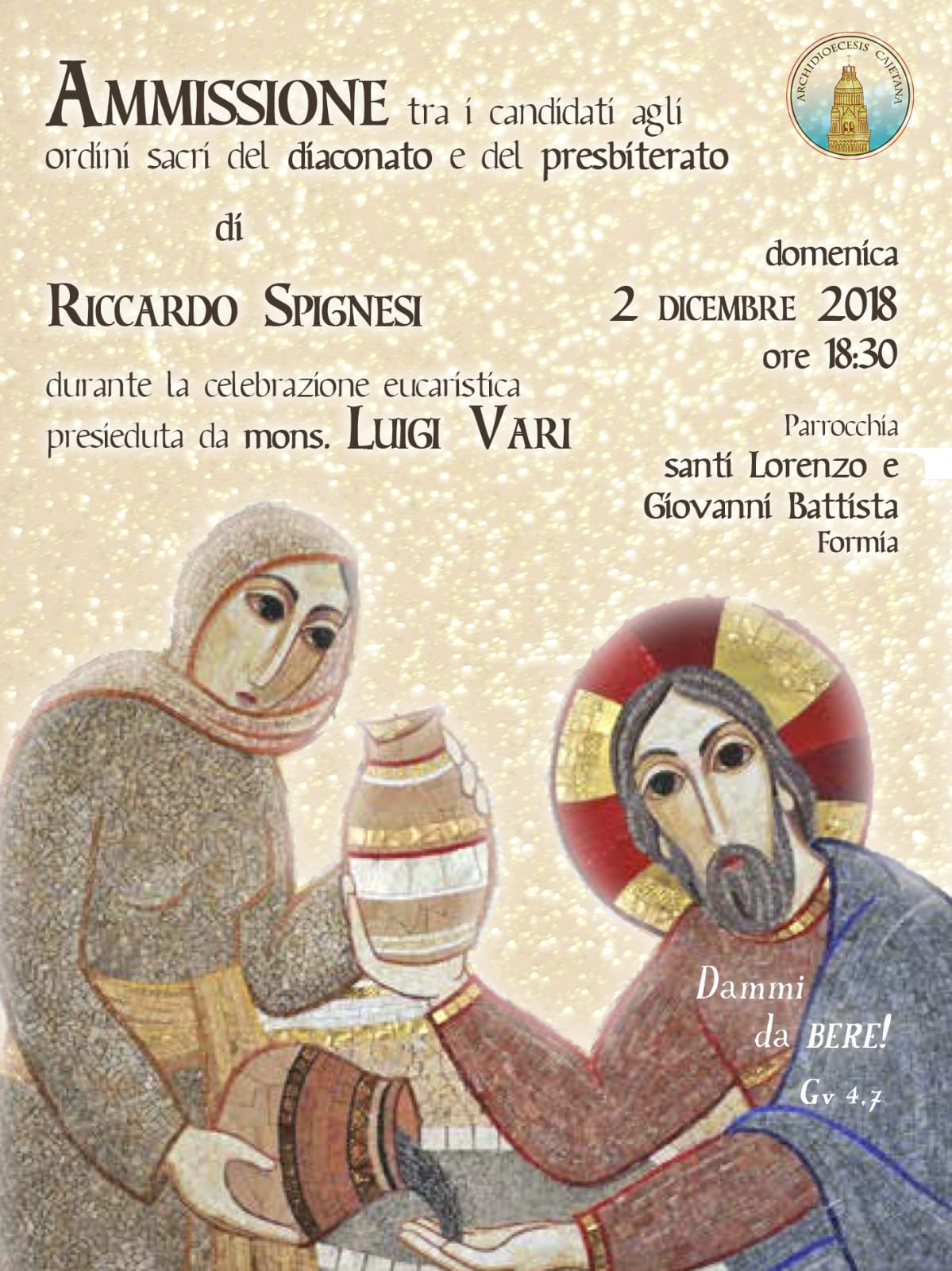 Riccardo ha scelto come motto dell’ammissione un versetto del vangelo secondo Giovanni, nel quale la samaritana chiede a Gesù: “Dammi da bere” (Gv 4,7).