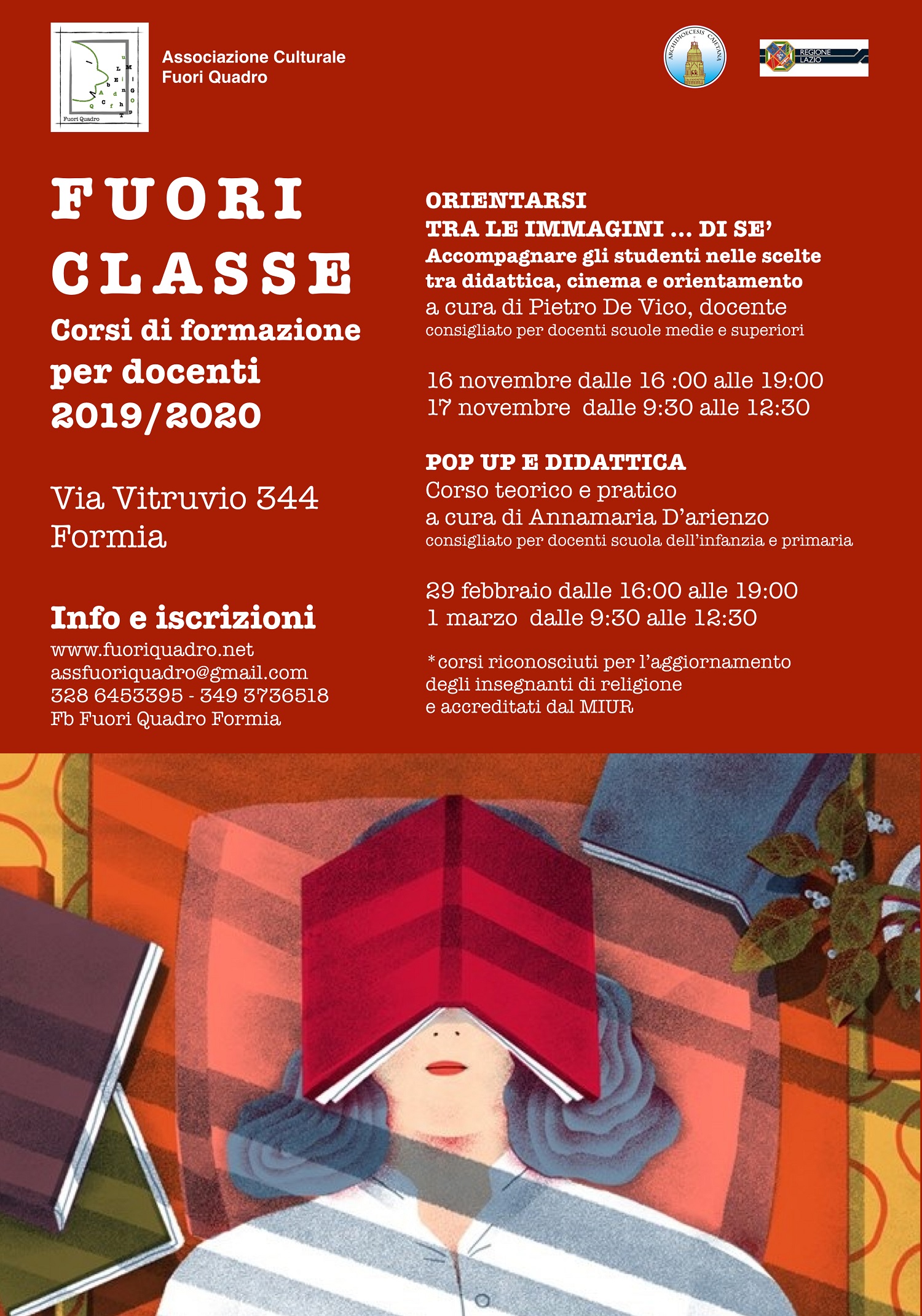 Si prosegue, sempre presso la sede di Fuori Quadro, in via Vitruvio 344 a Formia, il 29 febbraio dalle 16 alle 19 e il 1 marzo dalle 9.30 alle 12.30 sul tema “Pop up e didattica” corso teorico e pratico a cura di Annamaria D’arienzo e consigliato per docenti di scuola dell’infanzia e primaria.