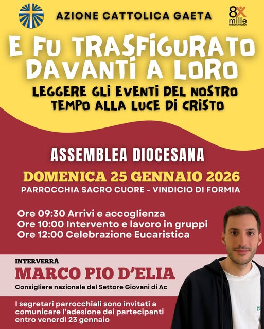 Domenica 25 gennaio 2026 l’Azione Cattolica di Gaeta si ritroverà per vivere l’assemblea diocesana, un appuntamento significativo di ascolto, confronto e discernimento, dal titolo “E fu trasfigurato davanti a loro. Leggere gli eventi del nostro tempo alla luce di Cristo”.