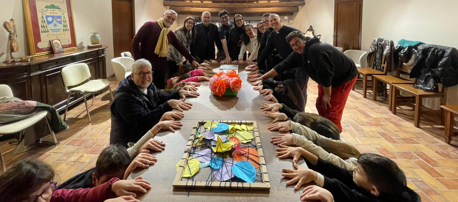 In occasione del Santo Natale, i bambini e i ragazzi della parrocchia di santa Maria in Piazza di Fondi, in rappresentanza di tutti gli “acierrini” della diocesi, si sono recati da monsignor Vari per lo scambio di auguri, portando dei doni realizzati durante gli incontri Acr del sabato pomeriggio. I ragazzi, infatti, leggendo la Lettera pastorale “Le nostre comunità, case di pace e di futuro”, guidati dagli educatori, hanno riflettuto sul termine comunità e in che modo essa possa essere una vera casa, accogliente e aperta alla pace e al dialogo. In particolare, le tre fasce, 6-8, 9-11 e 12-14, hanno concretizzato il contenuto della lettera, realizzando rispettivamente dei fiori, un muro e un vero e proprio cielo di speranza. I più piccoli, infatti, hanno spiegato all’Arcivescovo che i fiori rappresentano ognuno di loro, ma anche tutte le persone che incontrano nella loro vita, da accogliere sempre, in tutta la loro bellezza e unicità. Il muro, a sua volta, inteso come elemento che rende stabile e salda una casa, indica gli atteggiamenti che, secondo i ragazzi, rendono forte una comunità e i talenti che mettono a disposizione della stessa. Il cielo di speranza, infine, è un reticolato di stelle e pianeti sui quali i ragazzi più grandi hanno scritto un gesto concreto di pace per la comunità, come un abbraccio o una preghiera per una persona cara. Si è trattato, dunque, di doni semplici che, seppur realizzati da piccole mani, sono stati in grado esprimere un grande messaggio.