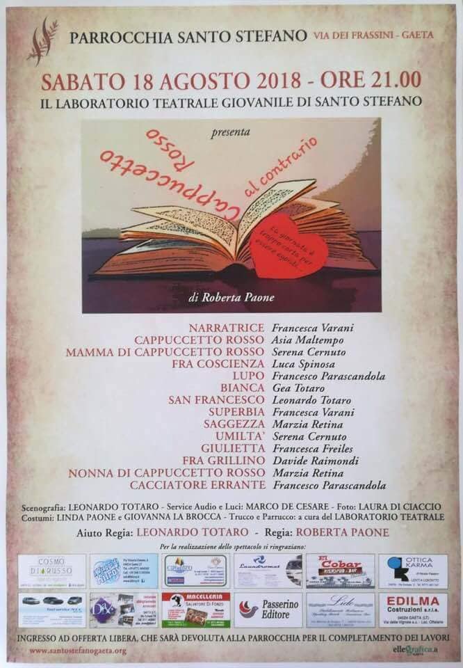 Nell’ambito delle svariate attività estive promosse dalla Parrocchia di Santo Stefano in Gaeta ed al termine del primo anno di corso teatrale che si è tenuto lo scorso inverno, i giovani del “Laboratorio Giovanile Teatrale di Santo Stefano”, sabato 18 agosto alle ore 21.00 presso la parrocchia di Santo Stefano in Gaeta, andranno in scena con lo spettacolo dal titolo “Cappuccetto Rosso al contrario” scritto e diretto dai loro insegnanti Roberta PAONE e Leonardo TOTARO.