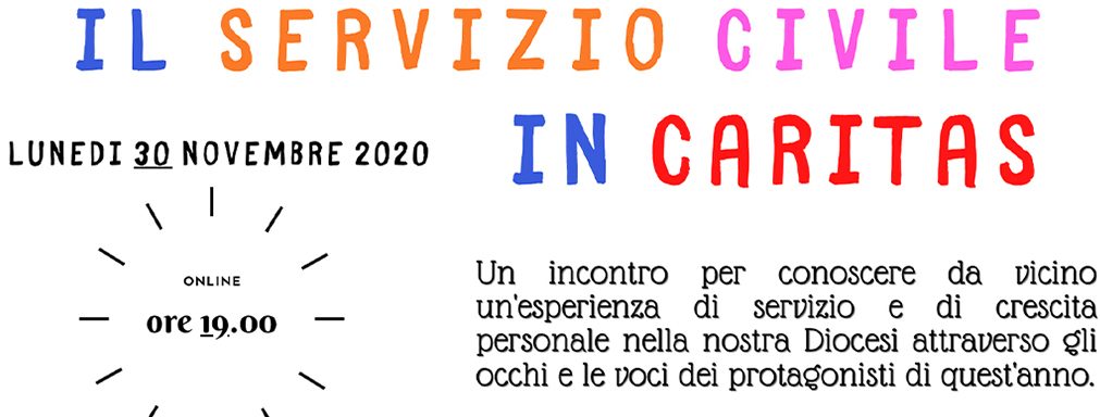 Lunedì 30 novembre alle ore 19.00 si terrà l’incontro “Il Servizio Civile in Caritas”, per conoscere da vicino un’esperienza di servizio e di crescita personale nella nostra arcidiocesi attraverso gli occhi e le voci dei protagonisti di quest’anno.