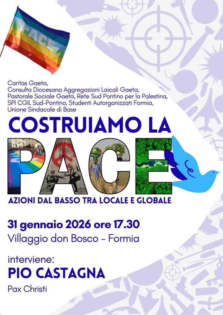 Per questo, il Laboratorio di Pace, che vede insieme Caritas di Gaeta, Consulta Diocesana delle Aggregazioni Laicali Gaeta, Pastorale Sociale di Gaeta, Rete Sud Pontino per la Palestina, SPI-CGIL Sud-Pontino, Studenti Autorganizzati Formia, Unione Sindacale di Base, nell’evento intitolato “Costruiamo la pace – azioni dal basso tra locale e globale”, avrà modo di sottolineare le azioni che si possono realizzare nel nostro territorio e persino come far giungere il nostro sostegno a livello globale.