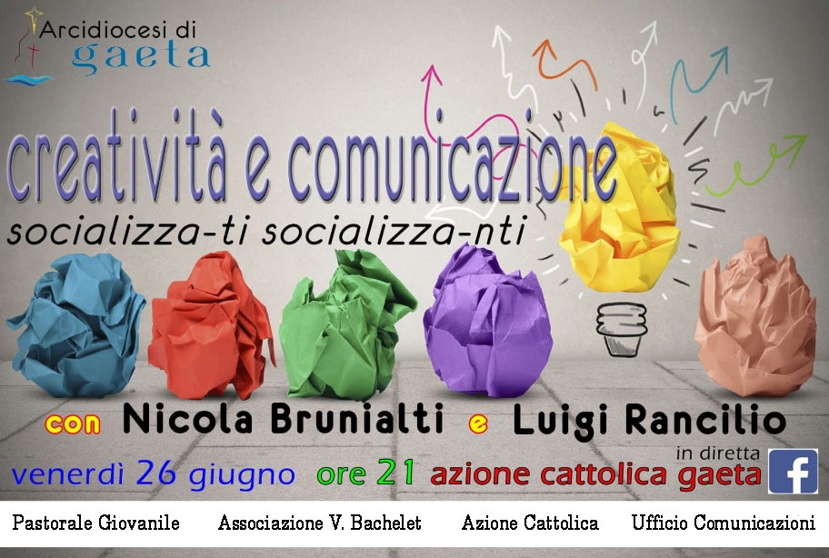 L’Associazione “Vittorio Bachelet”, l’Azione Cattolica, l’Ufficio Comunicazioni e la Pastorale Giovanile dell’Arcidiocesi di Gaeta presentano il webina dal titolo “Creatività e comunicazione – Socializzati e socializzanti” con Nicola Brunialti e Luigi Rancilio.