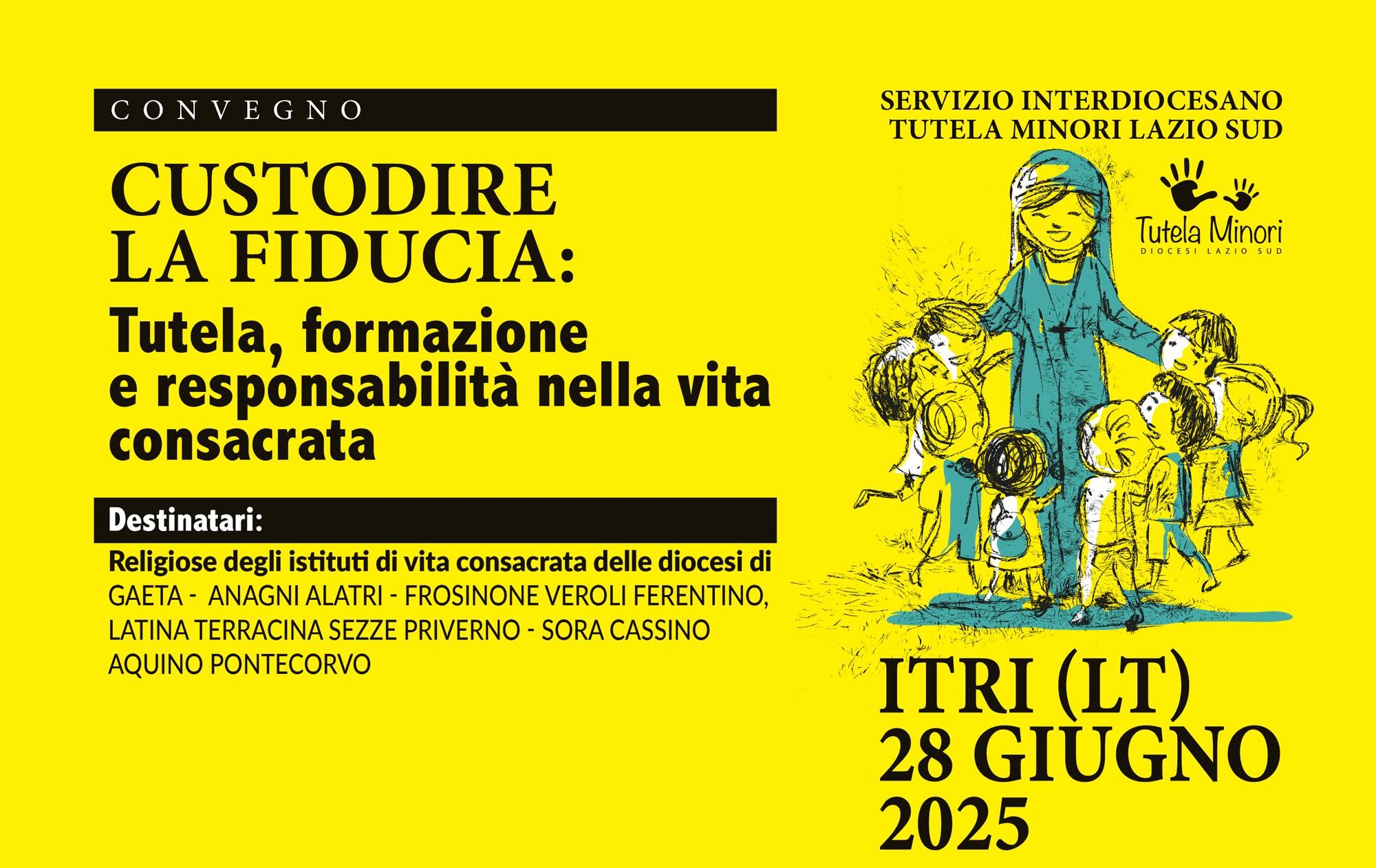 Il Servizio Interdiocesano Tutela Minori e Persone Vulnerabili del Lazio Sud promuove un importante momento formativo per le religiose delle diocesi del Lazio sud, che si terrà sabato 28 giugno 2025 alle ore 15.30 presso il Centro Pastorale “San Giovanni Paolo II” del Santuario della Civita a Itri. Il convegno, dal titolo “Custodire la fiducia: Tutela, formazione e responsabilità nella vita consacrata”, si inserisce nel cammino sinodale e nel più ampio impegno della Chiesa italiana per la protezione dei minori e delle persone vulnerabili, con un’attenzione particolare alla formazione nella vita religiosa femminile.