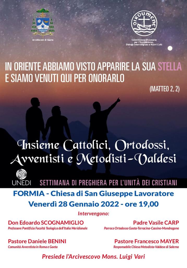 Venerdì alle 19 nella chiesa di San Giuseppe Lavoratore a Formia grazie alla disponibilità del parroco don Mario Testa si terrà la celebrazione dell’unità dei cristiani, presieduta dal vescovo di Gaeta Luigi Vari e curata dalla commissione diocesana per l’ecumenismo, il dialogo interreligioso e i nuovi culti di cui è direttore don Antonio Cairo.