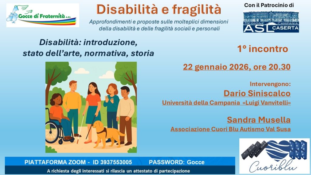 Nell’ambito del ciclo di webinar dedicato al tema “Disabilità e Fragilità”, l’associazione Gocce di Fraternità APS, con il patrocinio dell’ASL di Caserta, presenta il primo incontro che si terrà on line il 22 gennaio alle 20.30 su piattaforma Zoom, dal titolo: “Disabilità: introduzione, stato dell’arte, normativa, storia”.