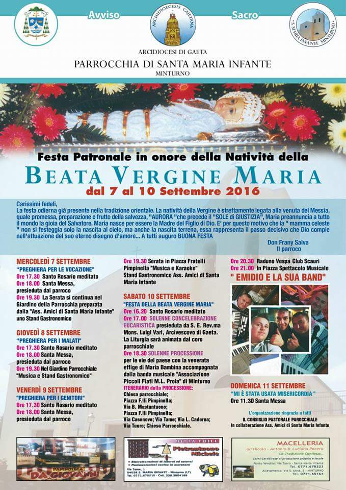 La parrocchia di Santa Maria Infante di Minturno organizza, dal 7 al 10 settembre, la festa patronale in onore della Natività della Beata Vergine Maria.