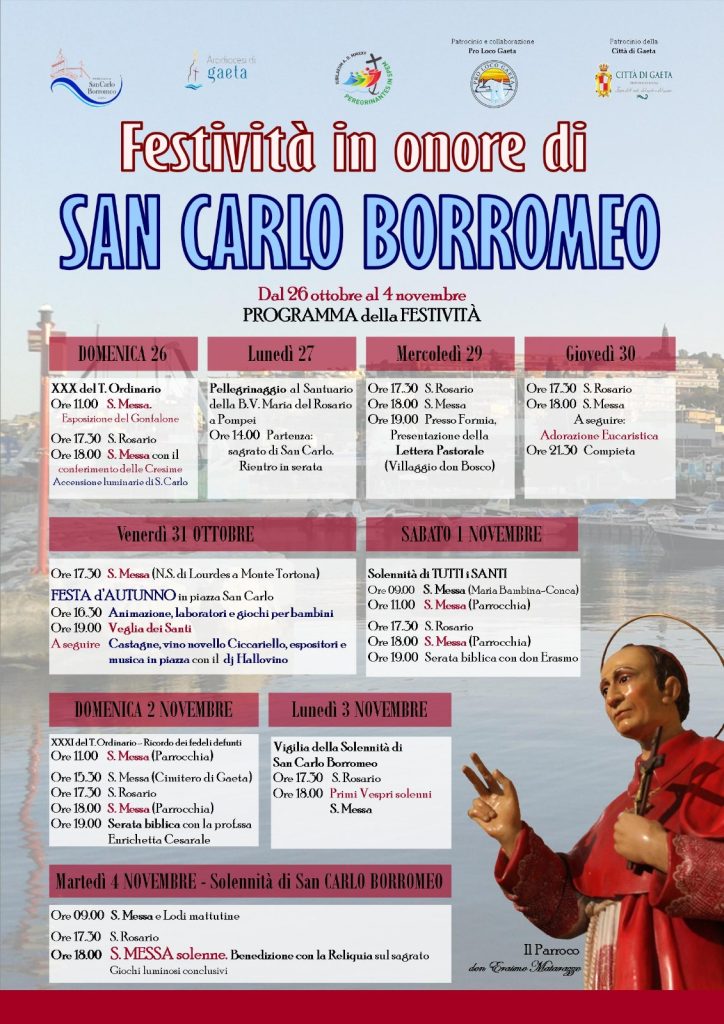 Domenica 26 ottobre si sono ufficialmente aperti i festeggiamenti in onore di san Carlo, a Gaeta, con l’esposizione del Gonfalone sul sagrato della Parrocchia; la statua, anch’essa esposta in chiesa, è dono del cardinale Montini, salito al soglio pontificio nel 1963 con il nome di papa Paolo VI.