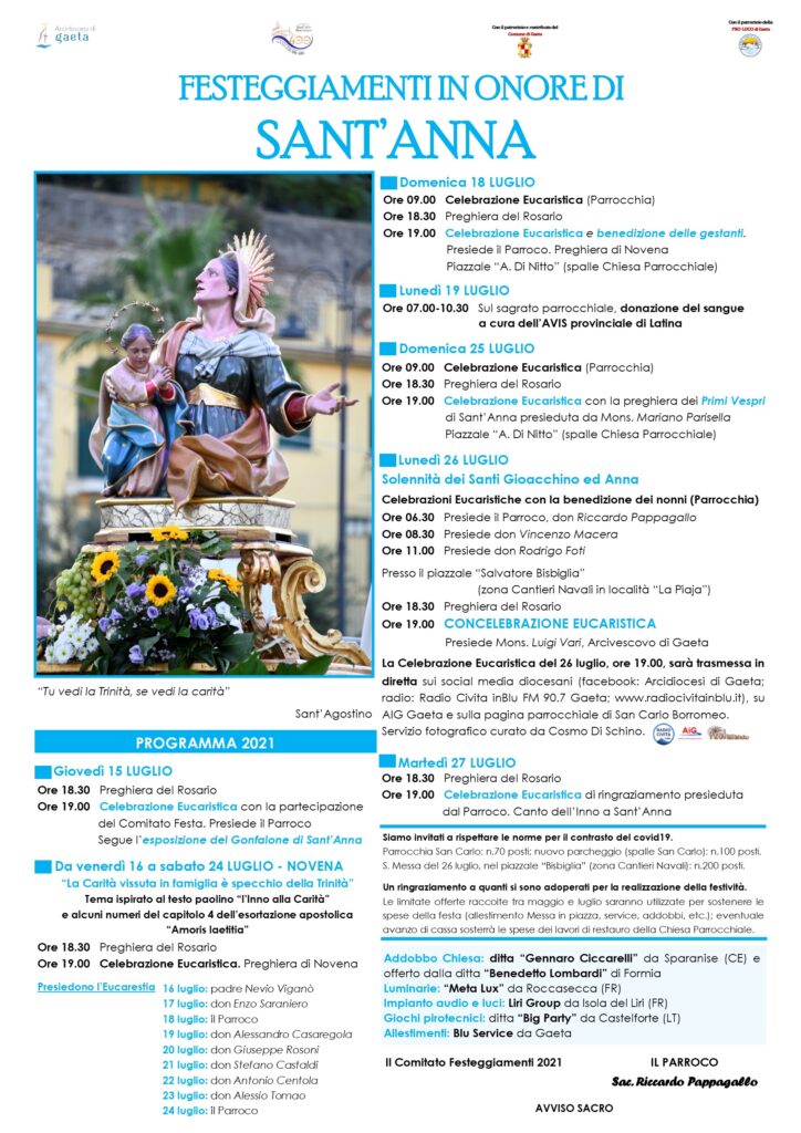 La comunità parrocchiale di San Carlo Borromeo in Gaeta, guidata dal Parroco, don Riccardo Pappagallo, si prepara per festeggiare la solennità di Sant’Anna, tanto attesa dagli abitanti del quartiere La Piaja e da tutta la città di Gaeta.