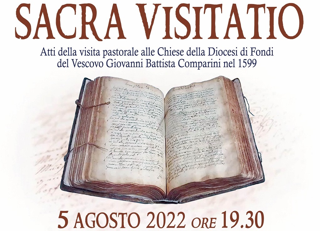 La Parrocchia di San Pietro Apostolo Fondi insigne e antica cattedrale, il Comune di Fondi e la locale Pro Loco, hanno organizzato la presentazione libera al pubblico del volume manoscritto recentemente restaurato: “Sacra Visitatio”. Atti della visita pastorale alle Chiese della Diocesi di Fondi, nel 1599, dal Vescovo Giovanni Battista Comparini. L’evento si terrà venerdì 5 agosto 2022 a Fondi nel Duomo di San Pietro con inizio alle ore 19,30.