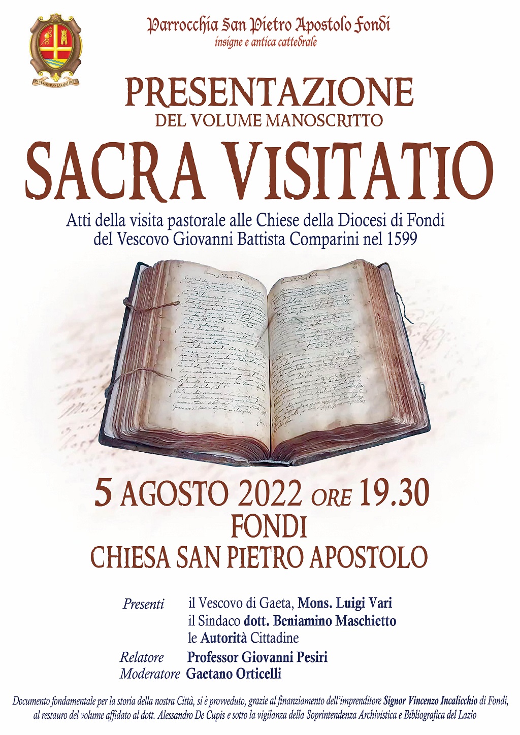La Parrocchia di San Pietro Apostolo Fondi insigne e antica cattedrale, il Comune di Fondi e la locale Pro Loco, hanno organizzato la presentazione libera al pubblico del volume manoscritto recentemente restaurato: “Sacra Visitatio”. Atti della visita pastorale alle Chiese della Diocesi di Fondi, nel 1599, dal Vescovo Giovanni Battista Comparini. L’evento si terrà venerdì 5 agosto 2022 a Fondi nel Duomo di San Pietro con inizio alle ore 19,30.