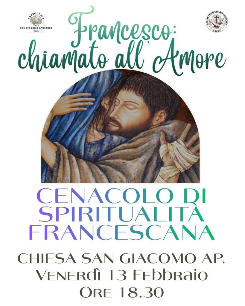 Nel tempo di grazia dell’ottavo centenario della morte di San Francesco d’Assisi, la Fraternità dell’Ordine Francescano Secolare di Gaeta con la Parrocchia San Giacomo Apostolo propone un “cenacolo” di spiritualità francescana, sul tema “Francesco, chiamato all’amore”, come occasione di ascolto, riflessione e rinnovamento interiore per venerdì 13 febbraio alle ore 18.30 presso la Chiesa di San Giacomo Apostolo in Gaeta.