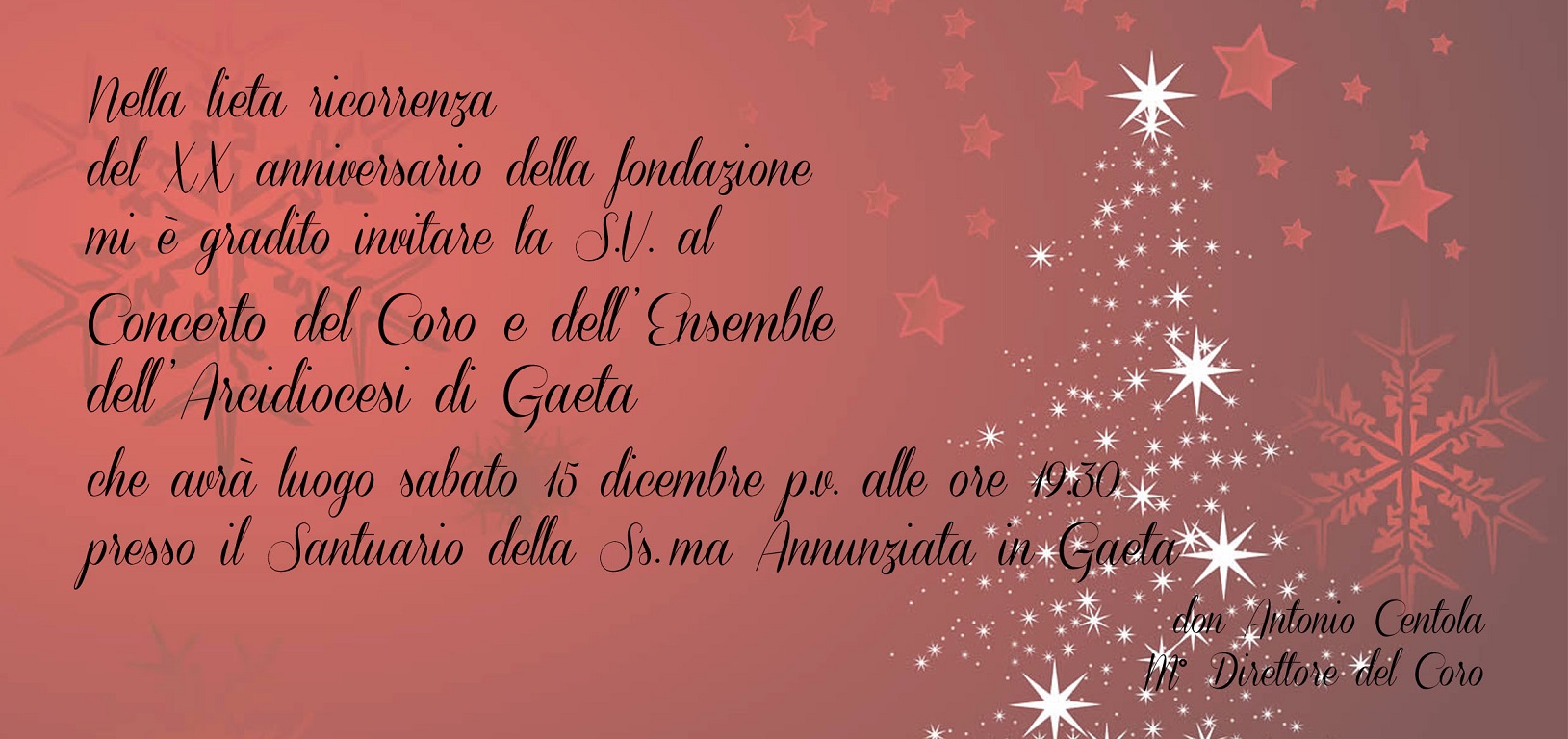 Nella maestosa cornice del Santuario della SS. Annunziata in Gaeta (LT) il prossimo 15 dicembre alle ore 19.30, il Coro dell’Arcidiocesi di Gaeta offrirà un concerto in preparazione alle Feste di Natale, ma in particolare quest’anno anche per celebrare il ventesimo anniversario della propria fondazione. Infatti, fu per l’ordinazione diaconale di cinque seminaristi che il 7 dicembre del 1998 si riunì per la prima volta il gruppo di cantori che, sotto l’iniziale guida del M° Biancamaria Spirito, divenne poi stabilmente il coro a servizio degli eventi a carattere diocesano.