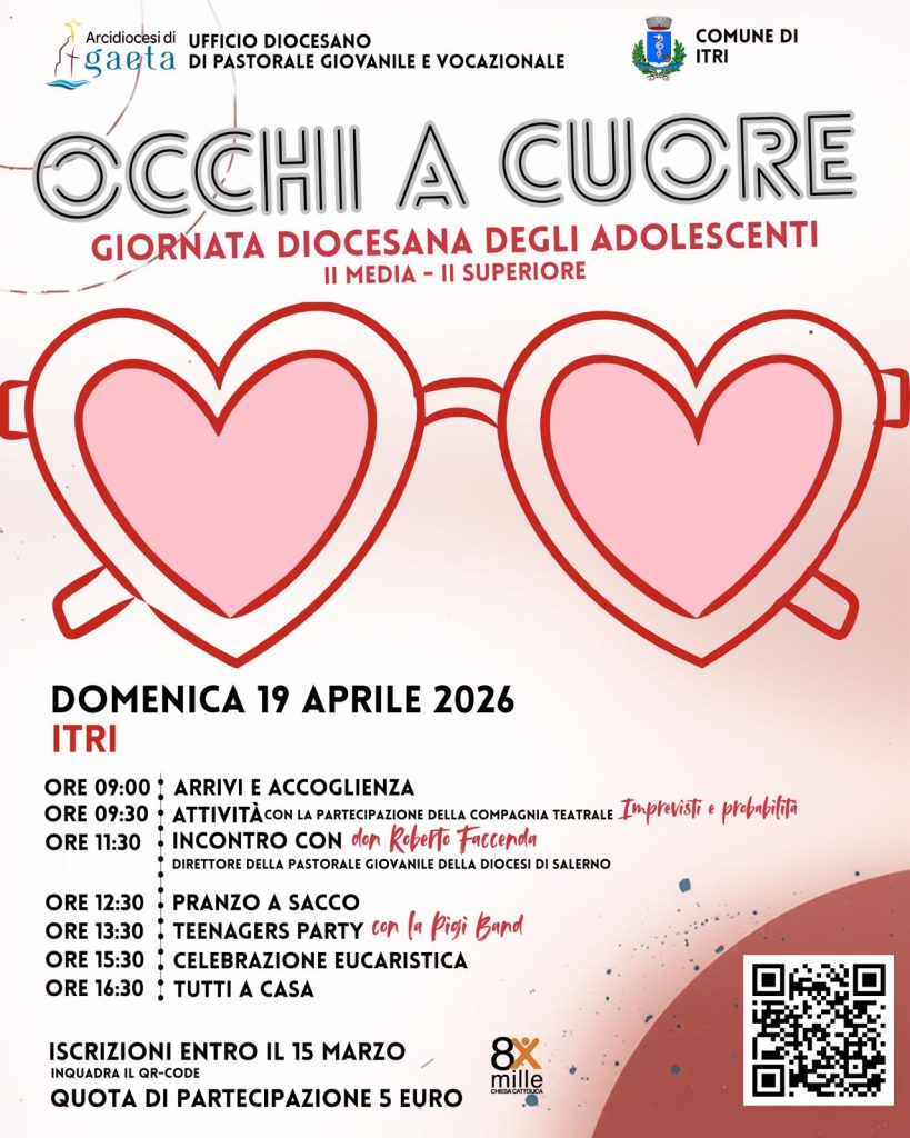 L’Ufficio diocesano di Pastorale Giovanile e Vocazionale annuncia che domenica 19 aprile 2026, presso Piazzale Rodari a Itri, si terrà la giornata diocesana degli adolescenti, rivolta a tutti i ragazzi che quest’anno stanno frequentando dalla II media al II superiore.