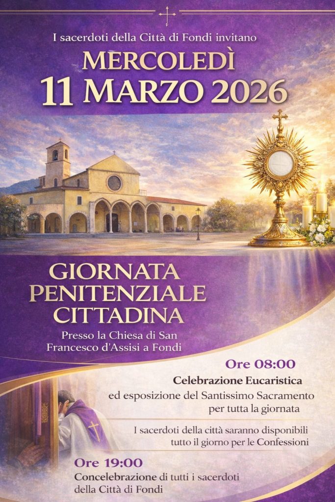 Mercoledì 11 marzo 2026 la comunità ecclesiale di Fondi vivrà uno dei momenti più significativi del cammino quaresimale con la Giornata Penitenziale Cittadina, promossa dai sacerdoti della città come segno di unità presbiterale e di comunione. L’iniziativa si svolgerà presso la Chiesa di San Francesco d’Assisi, che per l’intero giorno diventerà cuore spirituale della comunità, luogo di adorazione, silenzio e riconciliazione.