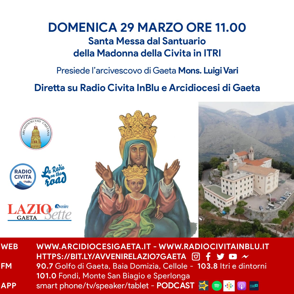 Domenica 29 marzo alle ore 11.00 in diretta dal Santuario della Madonna della Civita in Itri (LT) sarà trasmessa la Messa presieduta dall’arcivescovo di Gaeta Luigi Vari. La Messa vuole essere un segno di speranza e di preghiera alla Madonna della Civita, compatrona della Arcidiocesi di Gaeta.
