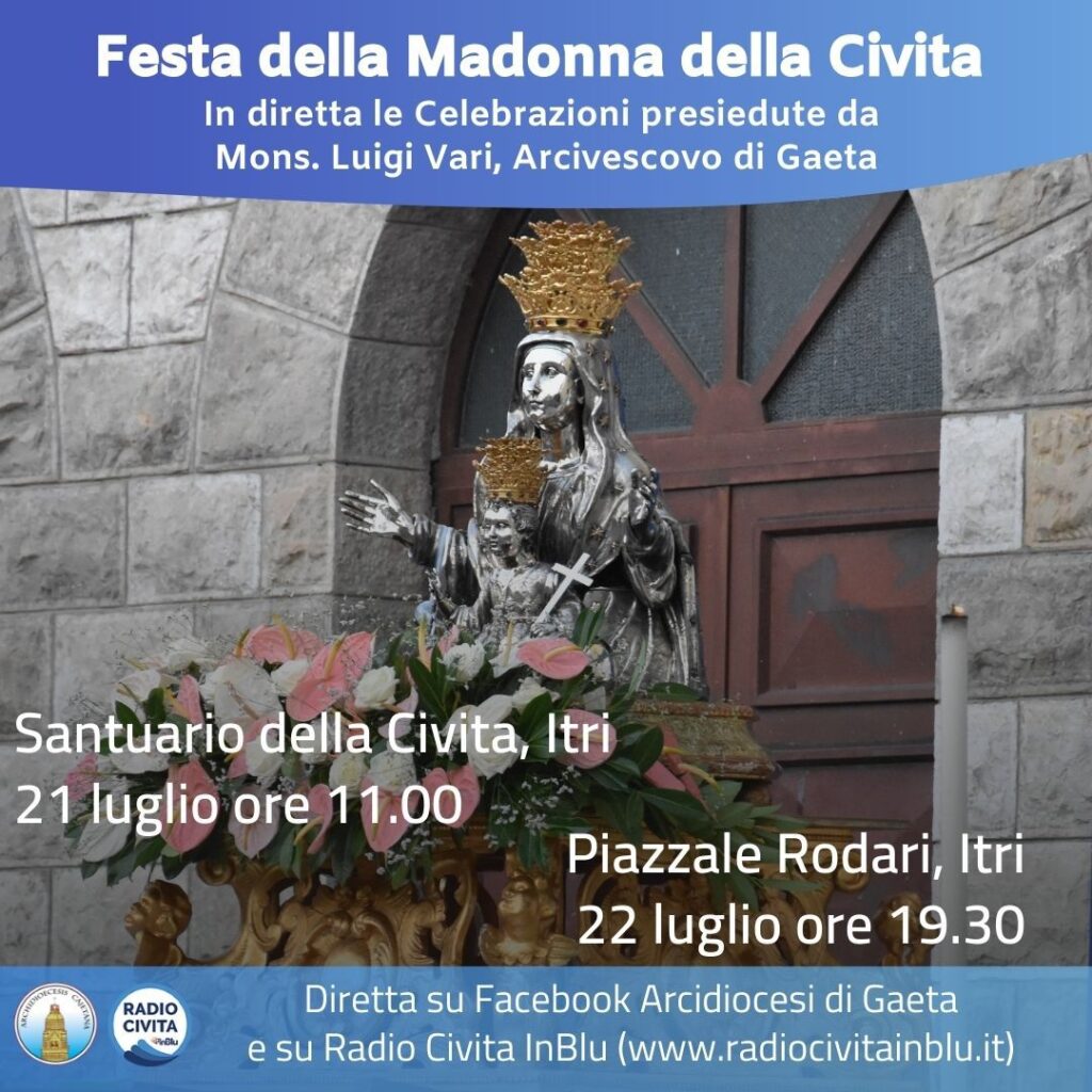 In occasione della Festa della Madonna della Civita 2021 di Itri, i media diocesani trasmetteranno le celebrazioni eucaristiche presiedute dall’arcivescovo di Gaeta Luigi Vari. Le Messe saranno celebrate mercoledì 21 luglio alle ore 11.00 dal Santuario della Madonna della Civita e giovedì 22 luglio alle ore 19.30 in diretta da Piazza Rodari, nel cuore di Itri.