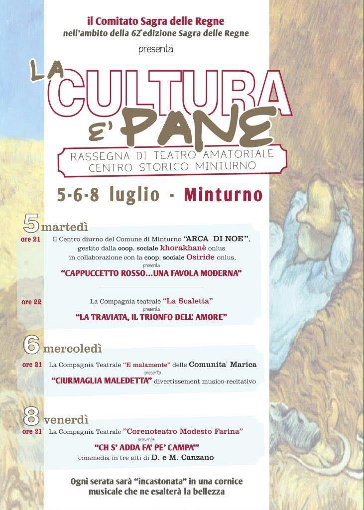 Il comitato “Sagra delle regne”, nell’ambito della 62° edizione dell’omonima sagra, presenta “La cultura è pane”, rassegna di teatro amatoriale in programma dal 5 all’8 luglio presso il centro storico di Minturno.