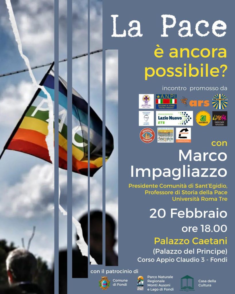 Venerdì 20 febbraio alle 18.00, presso il salone di Palazzo Caetani, in Corso Appio Claudio 3 a Fondi, avrà luogo un incontro sul tema della pace che vedrà intervenire, nella figura di relatore, Marco Impagliazzo, presidente della Comunità di Sant’Egidio, professore di Storia della Pace all’Università di Roma Tre e da sempre molto legato alla città di Fondi.