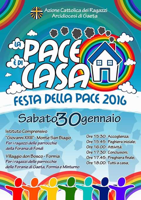 Ogni anno l'Azione Cattolica dei ragazzi nel mese di gennaio dedica un'attenzione particolare al tema della pace, mai attuale come in questo momento. Pace come stile di vita, come educazione alla fratellanza, alla diversità, come attenzione per la realtà che ci circonda ed il bene comune. Con questo spirito l'Azione Cattolica dei Ragazzi dell'Arcidiocesi di Gaeta promuove il 30 Gennaio un momento di festa diviso per le due foranie: per i ragazzi delle parrocchie della Forania di Fondi presso l'IC Giovanni XXIII di Monte S. Biagio e per i ragazzi delle parrocchie delle Foranie di Formia, Gaeta e Minturno presso il Villaggio Don Bosco a Formia. La pace è davvero di Casa!