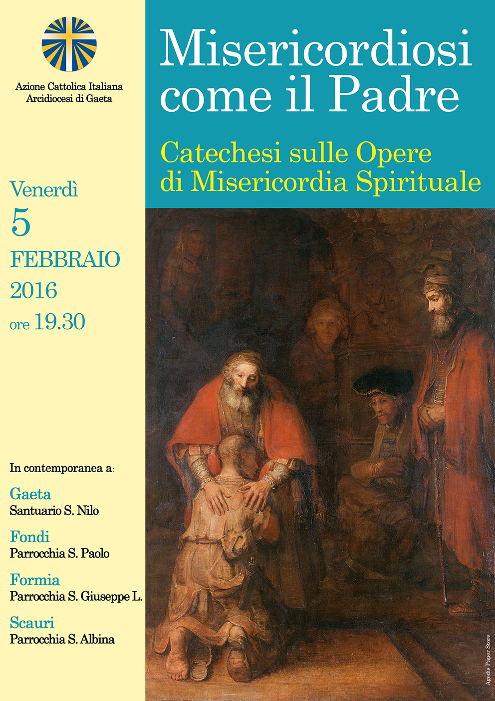 Venerdì 5 febbraio, alle 19:30, in contemporanea in quattro città e Chiese dell’Arcidiocesi – il Santuario S. Nilo di Gaeta, la Parrocchia S. Paolo di Fondi, la Parrocchia S. Giuseppe Lavoratore di Formia e la Parrocchia S. Albina di Scauri -, avrà luogo il secondo incontro di Catechesi sulle Opere di Misericordia Spirituale, organizzato dall’Azione Cattolica dell’Arcidiocesi di Gaeta.