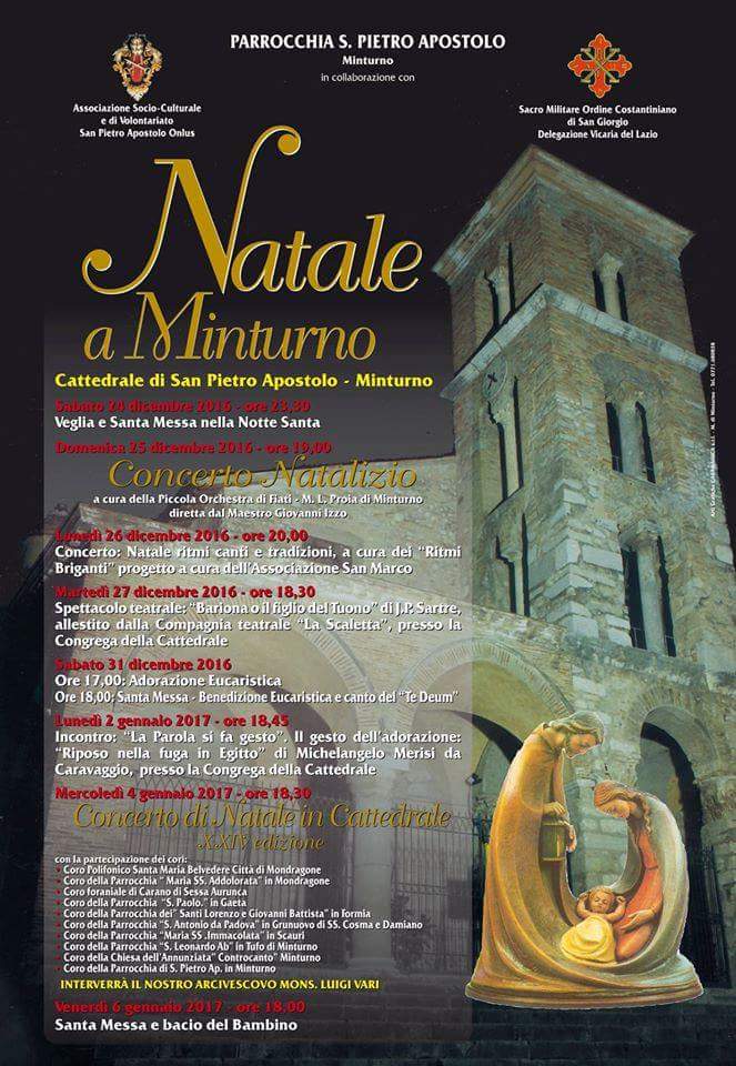 La parrocchia di San Pietro Apostolo di Minturno, in collaborazione con l’associazione socio-culturale e di volontariato San Pietro Apostolo onlus e la delegazione vicaria del Lazio del Sacro Militare Ordine Costantiniano di San Giorgio, organizza, presso la Cattedrale di San Pietro Apostolo, il “Natale a Minturno”.