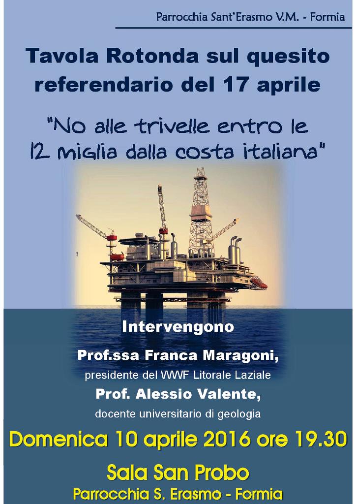 Domenica 10 aprile, alle ore 19:30, la Parrocchia Sant’Erasmo V.M. di Formia organizza, presso la Sala San Probo, una tavola rotonda sul quesito referendario del prossimo 17 aprile, dal titolo “No alle trivelle entro le 12 miglia dalla costa italiana”.
