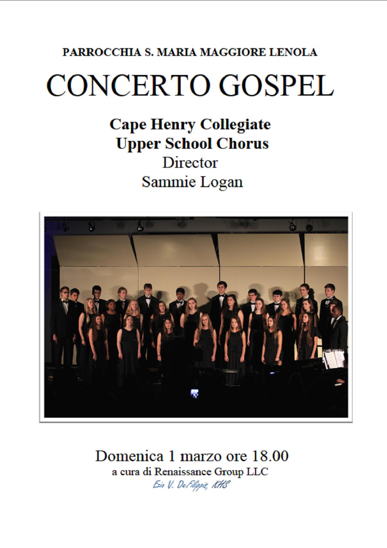 mercoledì 25 Febbraio 2015News da parrocchie e territorio Parrocchia Santa Maria Maggiore di Lenola Cape Henry Collegiate Upper School Chorus Director Sammie Logan Domenica 1 marzo, ore 18.00 a cura di Renaissance Group LLC Ezio V. DeFilippis, KHS condividi su