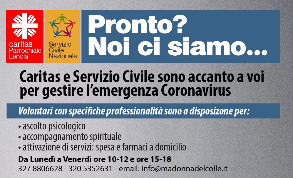 È attivo per la città di Lenola e per tutto il territorio diocesano a cura di Caritas Lenola e Servizio Civile di Lenola un servizio telefonico di ascolto e sostegno psicologico o spirituale.  Volontari e specialisti con specifiche professionalità  sono a disposizione  per