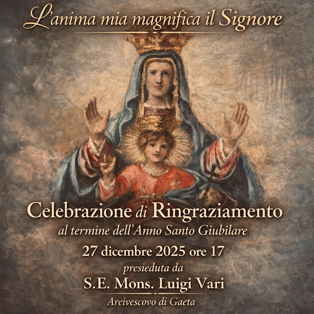 Sabato 27 dicembre 2025, alle ore 17.00, presso il Santuario di Maria Santissima della Civita, si terrà la Celebrazione eucaristica di ringraziamento al termine dell’Anno Santo, presieduta da S.E. Mons. Luigi Vari, Arcivescovo di Gaeta.