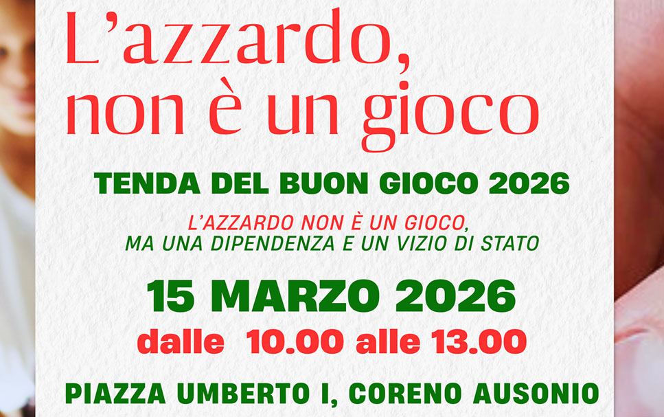 Il Tavolo di Lavoro contro l’Azzardo e di Cittadinanza Attiva, coordinato dalla Caritas Diocesana di Gaeta, organizza, con il Patrocinio del Comune di Coreno Ausonio, la Tenda del Buon Gioco il prossimo 15 marzo 2026, dalle 10.00 alle 13.00, in piazza Umberto I a Coreno Ausonio. Una mattinata di consapevolezza, informazione e gioco sano per dire con forza che l’azzardo non è un gioco, ma una dipendenza patologica che colpisce individui e famiglie.